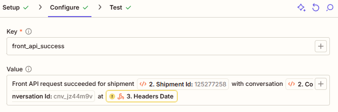 Go into the two Send Front API custom request steps and find the Configure tab. Update the following: