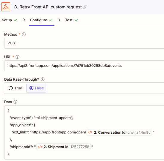 - The retry path ends with another Webhooks by Zapier step that makes a custom request to the Front API for app triggers. This step should be configured identically to the one earlier in the process.
