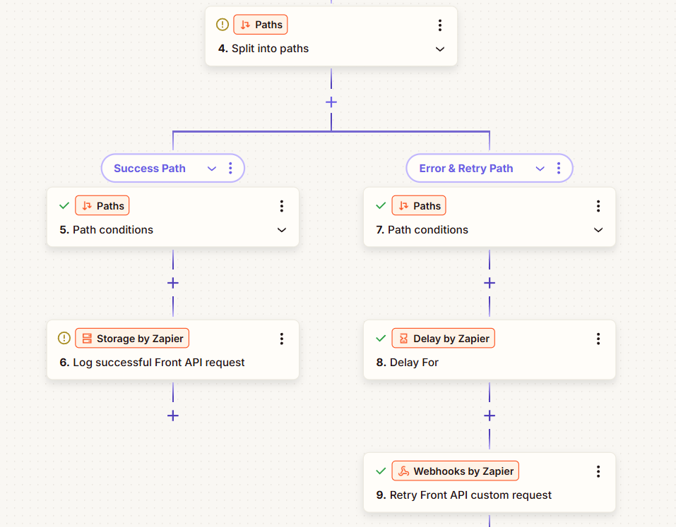 A branching success and retry path. This path handles situations when the Front application trigger endpoint returns an error to Zapier, most likely because the app object identified in the