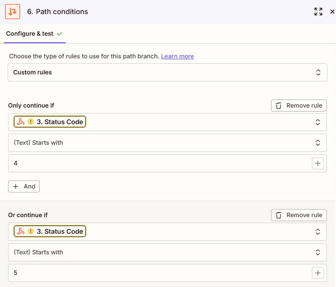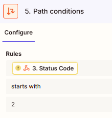 The retry path occurs when Front responds with a status code in the 400 or 500 range. In the error path case, Zapier waits 1 minute and then retries the API request to Front. The following screenshot shows the Path conditions for the error path.